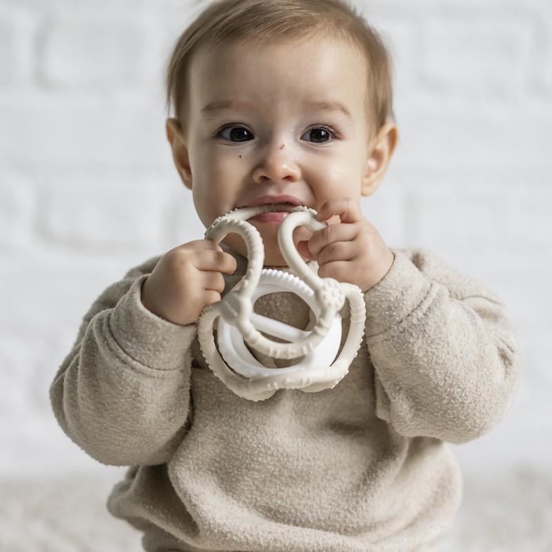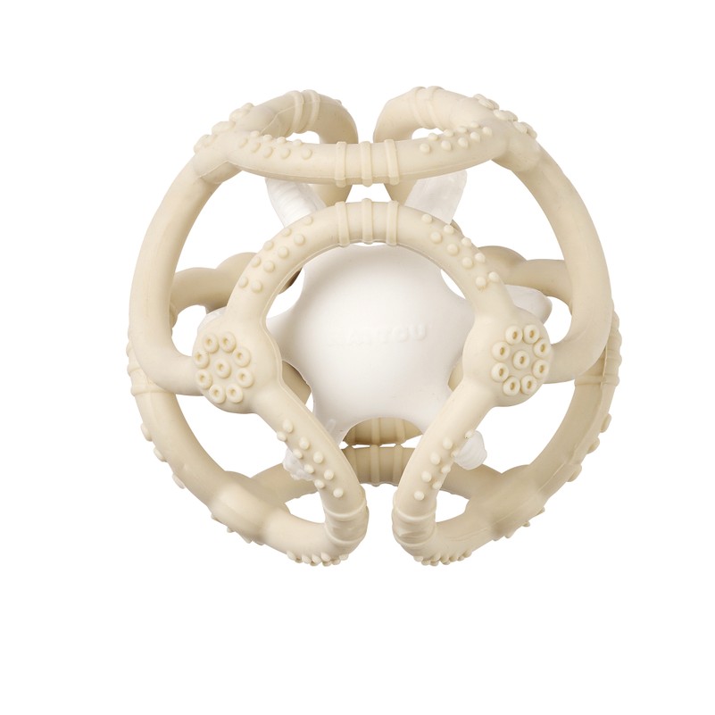 Šīs divkrāsainās silikona bumbiņas ir izstrādātas, lai veicinātu mazuļu maņu attīstību. Kā zobgrauznis tas nomierina sāpošas smaganas ar raupju, masējošu virsmu. Kā grabulītis tas stimulē taustes sajūtu ar dažādām tekstūrām un caurumiem. Bumbiņas var salikt vienu otrā, piedāvājot daudzveidīgas rotaļu iespējas gan mājās, gan ceļojumos.