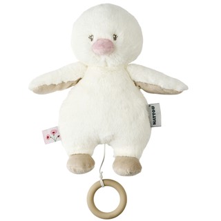 Maigās krāsās muzikālā plīša rotaļlieta ir īsts draugs jūsu mazulim. Pavelkot silikona riņķi, skan maiga “La-Le-Lu” melodija. Divas aukliņas ļauj to piestiprināt pie gultiņas, ratiņiem vai autosēdeklīša. Mazgāt ar rokām, neiegremdējot ūdenī.