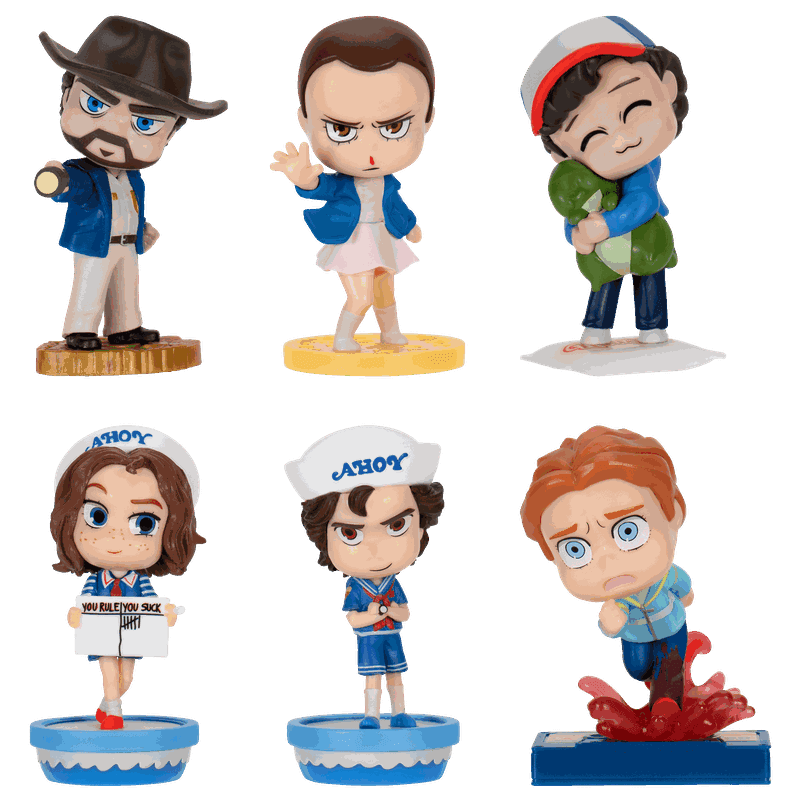 Atklāj mīlīgas, stilizētas 5 cm čibi figūriņas, kas radītas, iedvesmojoties no taviem iecienītākajiem Stranger Things tēliem. Katra figūra ir uz tematiska pampesta, kas attēlo ikonisku seriāla mirkli. Lieliski piemērotas kolekcionēšanai un izstādīšanai – katra aklā kaste rada aizraujošu pārsteiguma efektu!