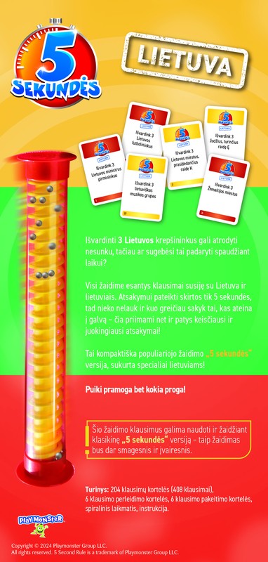 Jānosauc 3 Lietuvas futbolistus, taču vai to var izdarīt zem laika spiediena? Visi jautājumi attiecas uz Lietuvu un lietuviešiem. Jums ir 5 sekundes, tāpēc jūs sakāt visu, kas nāk uz mēles. Tiek sniegtas smieklīgas un dažreiz dīvainas atbildes, un bumbiņas lido pa īpaša taimera spirāli. Visvairāk pārdotās spēles 5 sekunžu kompakta versija Lietuvas realitātē! Varat arī izmantot jautājumu no šīs spēles versijas klasiskajā 5 sekunžu spēlē. Viņi dažādos jūsu jautrību. Lieliski piemērots jebkuram gadījumam!